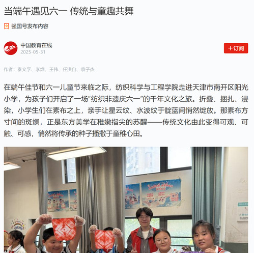 在端午佳节和六一儿童节来临之际,纺织科学与工程学院走进天津市南开区阳光小学,为孩子们开启了一场“纺织非遗庆六一”的千年文化之旅。折叠、捆扎、浸染,小学生们在素布之上,亲手让星云纹、水波纹于靛蓝间悄然绽放。那素布方寸间的斑斓,正是东方美学在稚嫩指尖的苏醒——传统文化由此变得可观、可触、可感,悄然将传承的种子播撒于童稚心田。