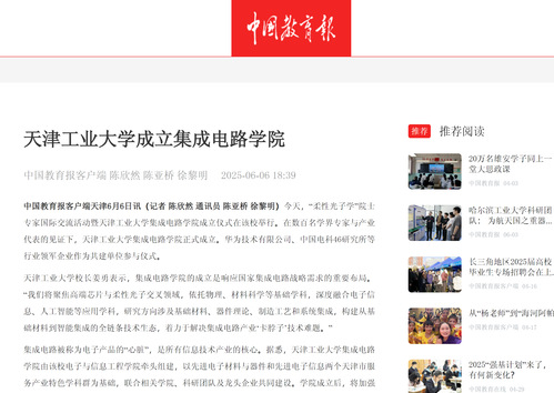 天津工业大学校长姜勇表示,集成电路学院的成立是响应国家集成电路战略需求的重要布局。“我们将聚焦高端芯片与柔性光子交叉领域,依托物理、材料科学等基础学科,深度融合电子信息、人工智能等应用学科,研究方向涉及基础材料、器件理论、制造工艺和系统集成,构建从基础材料到智能集成的全链条技术生态,着力于解决集成电路产业‘卡脖子’技术难题。”