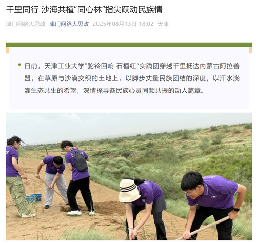 日前,天津工业大学“驼铃回响·石榴红”实践团穿越千里抵达内蒙古阿拉善盟,在草原与沙漠交织的土地上,以脚步丈量民族团结的深度,以汗水浇灌生态共生的希望,深情探寻各民族心灵同频共振的动人篇章。