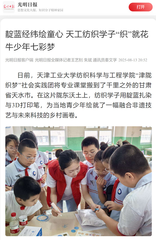 日前,天津工业大学纺织科学与工程学院“津陇织梦”社会实践团将专业课堂搬到了千里之外的甘肃省天水市。在这片陇东沃土上,纺织学子用靛蓝扎染与3D打印笔,为当地青少年绘就了一幅融合非遗技艺与未来科技的乡村画卷。