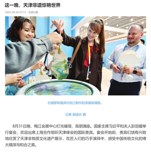 这场非遗文化展示,不仅让国际贵宾领略了中国传统文化的独特魅力,更在互动体验中增进了文明互鉴与人文交流。每一件作品、每一次演示、每一个体验,都成为讲述上合故事、中国故事、天津故事,传递和合之美的生动载体。