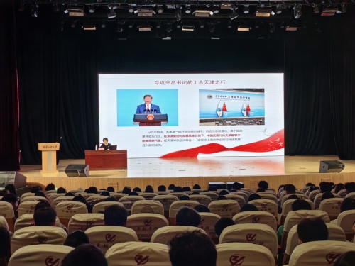 随后,胡艳丽以“爱国奋斗 强国励志”为题,为全体2025级新生带来了一堂深刻而生动的铸魂党课。她引导同学们明德立志,从历史中汲取精神力量,传承和弘扬抗战精神;她鼓励同学们立足“四个面向”,结合上合天津峰会成功举办的全新发展机遇,不断锤炼过硬本领、弘扬实干作风,将专业学习与实践创新紧密结合,为天津社会主义现代化大都市建设贡献青春力量;通过对一代代天纺人科教报国、服务社会生动事例的讲述,胡艳丽深刻阐释了纺织学科作为“母亲工业”的时代价值与创新使命,寄语全体新生要坚定不移听党话、跟党走,成长为有理想、敢担当、能吃苦、肯奋斗的新时代天纺人。她强调,今年是第10个全民国家安全教育日,本月也恰逢民族团结进步月,希望同学们做新时代好青年,生动讲好民族团结进步故事。