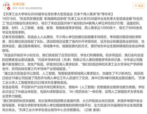 10月16日,“秋实筑梦展宏图 职海扬帆启新程”天津工业大学2026届毕业生秋季大型双选会暨“科创天工”校企对接会在该校举办,吸引了来自全国20余个省份的264家用人单位来校招才引智,涵盖纺织、服装、材料、人工智能、金融、教育、智能制造等多领域,用人需求达12000余个,吸引了6000余名毕业生现场求职。