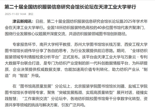 专家报告环节,南开大学柯平教授、苏州大学图书馆馆长钱万里、西安工程大学图书馆馆长胡伟华分享了各自的思考,为行业发展提供前沿思路。期间,“全球纺织服装领域专利情报检索分析平台”正式发布。该平台由天津工业大学与万象云・专利大数据平台联合打造,是专门为纺织产业定制的新一代科创数据情报平台,为科研提质、企业决策提供权威数据支撑,也能加速高价值专利转化,助力纺织产业从“制造”向“智造”升级。