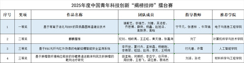 我校项目团队锐意进取、追求卓越,在主体赛中荣获国家级一等奖1项、二等奖2项、三等奖3项。同时,在2025年度中国青年科技创新“揭榜挂帅”擂台赛中,我校项目团队荣获国家级一、二等奖各1项、三等奖2项。