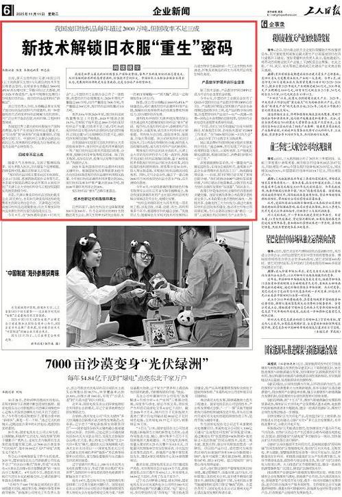 通用技术中纺院(天津)科技发展有限公司也通过技术创新解锁废旧纺织品“重生”密码。据介绍,在废旧纺织品中,涤棉混纺产品组分复杂、分离困难,成为再生利用中的主要难题。用传统方法回收,面临效率低、能耗高、污染大等问题。该公司研发的化学法回收技术,可以将涤纶和棉轻松分离,顺利进入回收循环流程,成为再生纺织产品的新原料。