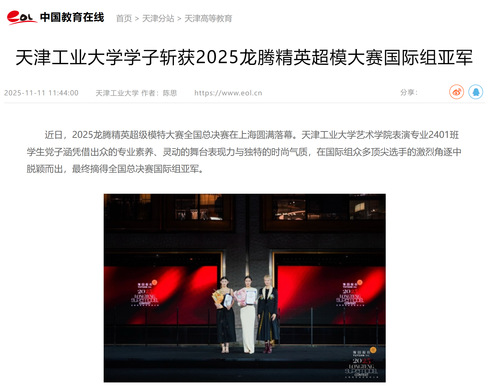 近日,2025龙腾精英超级模特大赛全国总决赛在上海圆满落幕。天津工业大学艺术学院表演专业2401班学生党子涵凭借出众的专业素养、灵动的舞台表现力与独特的时尚气质,在国际组众多顶尖选手的激烈角逐中脱颖而出,最终摘得全国总决赛国际组亚军。