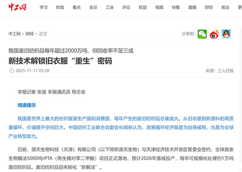 日前,源天生物科技(天津)有限公司(以下简称源天生物)与天津经济技术开发区管委会签约,全球首条生物酶法5000吨rPTA(再生精对苯二甲酸)项目正式落地,预计2026年落成投产,每年可规模化处理约1万吨废旧纺织品。废旧纺织品迎来转化“新解法”。