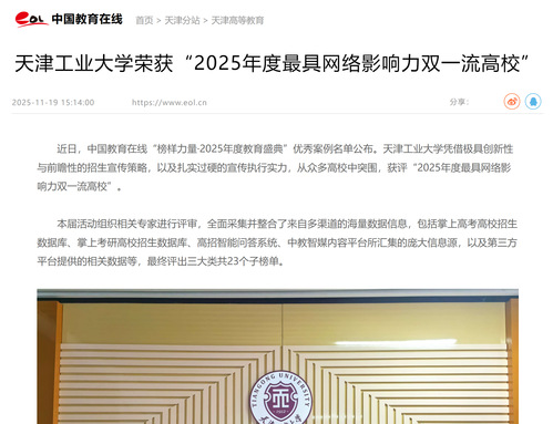 近日,中国教育在线“榜样力量·2025年度教育盛典”优秀案例名单公布。天津工业大学凭借极具创新性与前瞻性的招生宣传策略,以及扎实过硬的宣传执行实力,从众多高校中突围,获评“2025年度最具网络影响力双一流高校”。