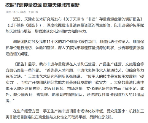 近日,天津市艺术研究所发布《关于天津市“非遗”存量资源盘活的调研报告》(以下简称《报告》),深度挖掘我市非遗存量资源的再生价值,以非遗保护传承赋能天津城市更新,增强津派文化的辐射力和影响力。