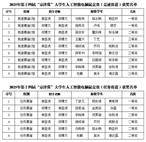 在日前落幕的2025年“启诚杯”第十四届“京津冀”大学生人工智能电脑鼠竞赛中,我校电子与信息工程学院迷宫机器人创新实践基地团队发挥出色,共斩获竞速赛项一等奖2项、二等奖1项、三等奖6项,协同赛项一等奖2项、二等奖4项,总成绩位列参赛高校前列,创下我校在该赛事中的历史最佳战绩。