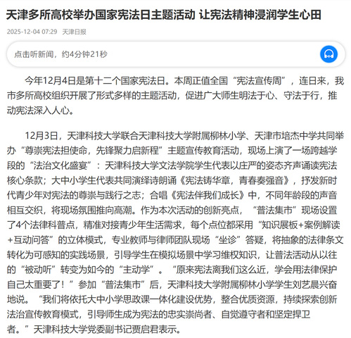 天津职业技术师范大学则将“法治课堂”搬到庭审现场,让学子零距离感受司法实践。12月2日,该校马克思主义学院50余名师生在津南区人民法院双港人民法庭开展以“筑牢信仰之基·弘扬宪法精神”为主题的实践教学活动,以庭审观摩和互动交流为主要形式,实现宪法宣传与思政课教学的深度融合。参加活动的学生纷纷表示,此次实践活动让宪法从“文本”走向“现实”,让他们不仅了解了司法审判流程,更深刻体会到我国宪法对维护社会公平正义具有重要作用。“我们将以实践教学基地为纽带,使普法宣传‘走新’更‘走心’,让宪法精神融入思政教育、浸润学生心田。”天津职业技术师范大学马克思主义学院党总支书记佟艳表示。