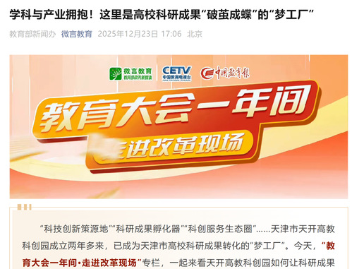 “科技创新策源地”“科研成果孵化器”“科创服务生态圈”……天津市天开高教科创园成立两年多来,已成为天津市高校科研成果转化的“梦工厂”。今天,“教育大会一年间·走进改革现场”专栏,一起来看天开高教科创园如何让科研成果“破茧成蝶”——