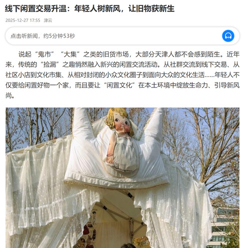 说起“鬼市”“大集”之类的旧货市场,大部分天津人都不会感到陌生。近年来,传统的“捡漏”之趣悄然融入新兴的闲置交流活动。从社群交流到线下交易、从社区小店到文化市集、从相对封闭的小众文化圈子到面向大众的文化生活……年轻人不仅要给闲置好物一个家,而且要让“闲置文化”在本土环境中绽放生命力、引导新风尚。