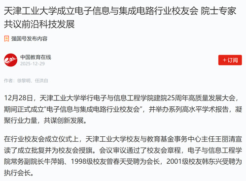 12月28日,天津工业大学举行电子与信息工程学院建院25周年高质量发展大会,期间正式成立“电子信息与集成电路行业校友会”,并举办系列高水平学术报告,凝聚行业力量,共谋创新发展。