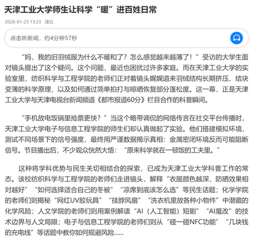“妈,我的旧羽绒服为什么不暖和了?怎么感觉越来越薄了!”受访的大学生面对镜头提出了这个疑问。这个问题,最近也困扰过许多家庭。而在天津工业大学的实验室里,纺织科学与工程学院的老师们正对着镜头娓娓道来羽绒结构长期挤压、结块变薄的科学原理,以及如何通过简单拍打与晾晒恢复部分蓬松度。这一幕,正是天津工业大学与天津电视台新闻频道《都市报道60分》栏目合作的科普瞬间。