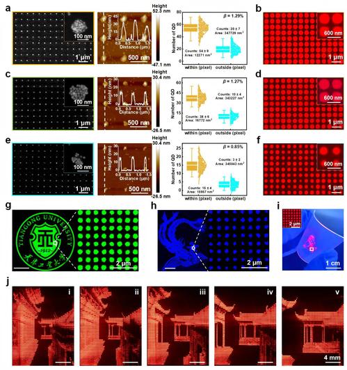 图2. 不同量子点浓度下纳米压印量子点像素阵列的特性。(a,c,e)不同浓度(2,1,0.5 mg/mL)下的 QD 组装表征。(b,d,f)不同浓度(2,1,0.5 mg/mL)下 QD 阵列的荧光显微图。绿色(g)与蓝色(h)特定图案展示。(i)柔性 PET 基底上的高分辨率小熊猫图案(弯曲状态)。(j)基于商用TFT阵列的微型 QLED 主动矩阵原型显示效果。