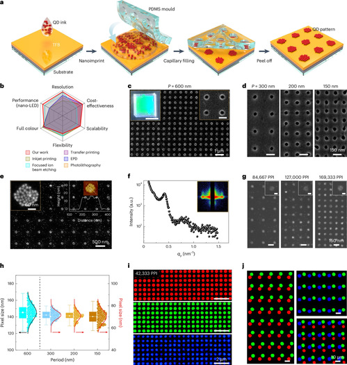图1. 基于毛细相互作用的超高分辨率纳米压印量子点图案化。(a)QD自组装纳米压印策略示意图。(b)不同制备方法性能对比。(c)PDMS纳米孔阵列模板SEM图。(d)不同周期PDMS纳米孔模板SEM图。(e)红色QD图案SEM图(P = 600 nm)。(f)红色QD图案的一维GISAXS数据。(g)超高像素密度QD图案SEM图。(h)像素尺寸分布统计图。(i)RGB三色QD图案荧光显微图。(j)多色QD阵列(RG/GB/RGB)荧光图。