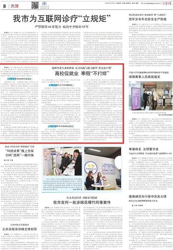 南开大学在该校“一站式”学生社区开展“寒假促就业暖心行动”,不仅每日安排专职辅导员值守,重点面向就业困难群体提供“一对一”精准帮扶,还专门在社区内设立面试亭,整合“神笔简历”“智面星”等人工智能体验平台,方便学生就近开展简历优化、沉浸式线上面试实战实训,并结合线下生涯咨询、就业指导等面对面服务量身定制“一人一策”个性化求职方案。天津工业大学除了积极对接重点用人单位、开展线上专场招聘会外,各学院还结合纺织、材料、机械等特色优势学科在线上开展行业培训与模拟面试,提升学生求职竞争力。