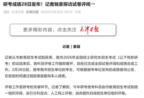 记者从市教育招生考试院获悉,我市2026年全国硕士研究生招生考试(以下简称研考)初试结束后,各科目评卷工作随即展开,目前已完成全部试卷评阅和成绩合成工作。2月28日起,报考我市招生单位的考生,可根据报考单位发布的成绩查询公告,在规定时间通过指定渠道查询本人成绩。