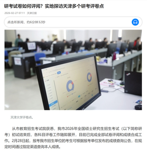 天津商业大学研究生处相关负责人说:“我校今年对网上评卷系统进行升级,提高了试卷识别清晰度,并改进评分偏离标准值监测功能,加强对各科目评卷进度和每名评卷教师评阅情况的实时跟踪监督。”