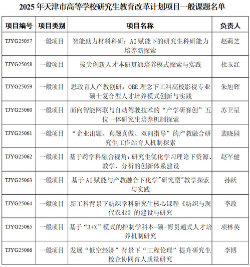 天津市高等学校研究生教育改革研究计划项目旨在全面落实党的二十大精神,坚守为党育人、为国育才的宗旨。项目以导师队伍“主力军”、课程建设“主战场”、课堂教学“主渠道”为抓手,通过立项建设,推动一流学科、一流课程、一流教材及联合培养基地的发展,是全面推进高层次创新型、复合型、应用型人才培养的重要举措。