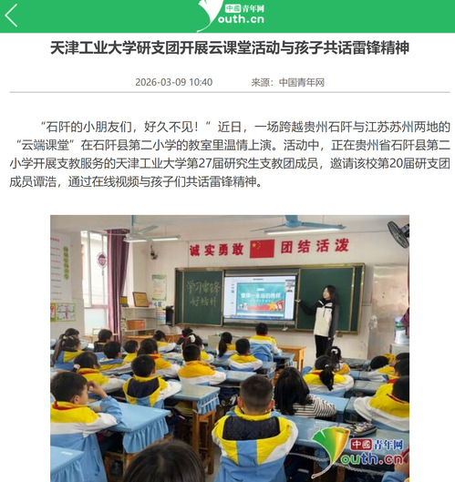 此次云课堂活动,既是对雷锋精神的时代化解读,也是天津工业大学研支团“传帮带”的生动体现。天津工业大学第27届研支团贵州队队长姜昕洋表示,研支团将继续在黔山大地深耕细作,积极链接校友资源,为服务地的孩子们打开更多通往广阔世界的窗户。(记者 李彦龙)