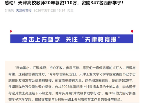 感动!天津高校教师20年募资110万,资助347名西部学子!