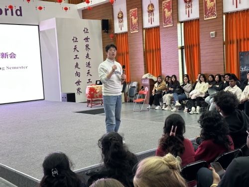 迎新会现场氛围热烈温馨,国际教育学院直属党支部书记、院长姜亚明发表致辞,向全体新生表示热烈欢迎。他回顾了学院“十四五”期间的跨越式发展成果,从教学质量提升、国际化合作深化到人才培养成效显著等方面,让新生们全面了解学院的综合实力。针对国际教育教学特色,姜亚明重点解读了“1+2+1”教育教学综合改革模式。同时,他还向新生们介绍了天津工业大学中华优秀传统文化与技艺国际传承创新基地的建设成果。姜亚明寄语全体新生,希望大家珍惜在华学习时光,努力学好汉语,深入了解中华优秀传统文化,积极参与基地文化体验活动,争做中外文明交流互鉴的友好使者,在跨文化交流中收获知识与友谊。