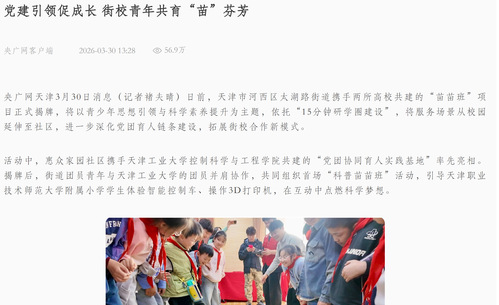 央广网天津3月30日消息(记者褚夫晴)日前,天津市河西区太湖路街道携手两所高校共建的“苗苗班”项目正式揭牌,将以青少年思想引领与科学素养提升为主题,依托“15分钟研学圈建设”,将服务场景从校园延伸至社区,进一步深化党团育人链条建设,拓展街校合作新模式。
