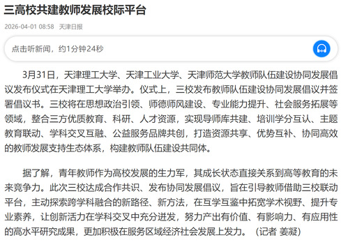 3月31日,天津理工大学、天津工业大学、天津师范大学教师队伍建设协同发展倡议发布仪式在天津理工大学举办。仪式上,三校发布教师队伍建设协同发展倡议并签署倡议书。三校将在思想政治引领、师德师风建设、专业能力提升、社会服务拓展等领域,整合三方优质教育、科研、人才资源,实现导师库共建、培训学分互认、主题教育联动、学科交叉互融、公益服务品牌共创,打造资源共享、优势互补、协同高效的教师发展支持生态体系,构建教师队伍建设共同体。