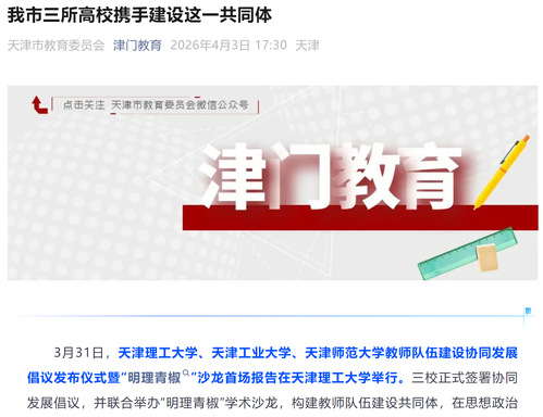 3月31日,天津理工大学、天津工业大学、天津师范大学教师队伍建设协同发展倡议发布仪式暨“明理青椒”沙龙首场报告在天津理工大学举行。三校正式签署协同发展倡议,并联合举办“明理青椒”学术沙龙,构建教师队伍建设共同体,在思想政治引领、师德师风建设、专业能力提升、社会服务拓展等领域开展深度合作,为天津高等教育高质量发展注入新活力。