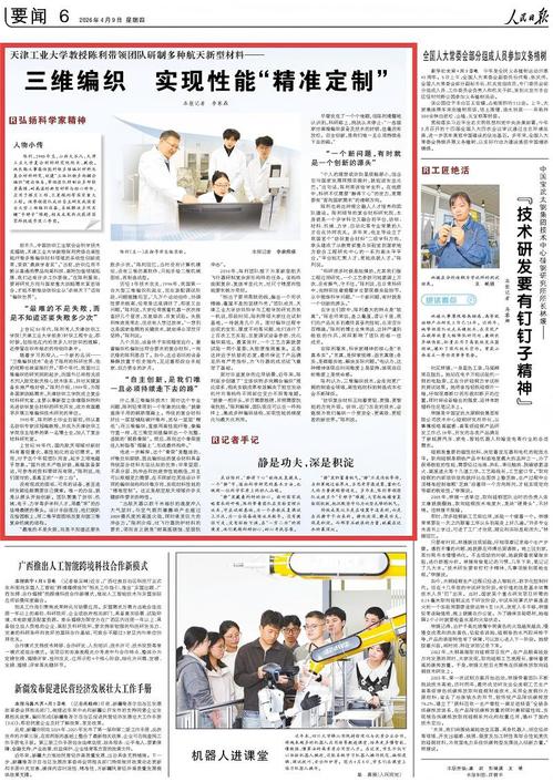 “相当于要用柔软的线,编出一个形状精确、毫厘不差的坚硬外壳。”团队成员、天津工业大学纺织科学与工程学院研究员张一帆说,那段时间,陈利带领大家住在试制基地,一待就是几个月。面对编织过程中出现的变形、厚度不均等问题,他们进行了上百次工艺实验,反复调试设备参数、优化编织路径。最紧张时,一个工艺方案就要试验一两个星期,失败便推倒重来。正是这种近乎执拗的态度,最终保证了产品满足所有严苛指标,为飞行器的成功试飞奠定了基础。
