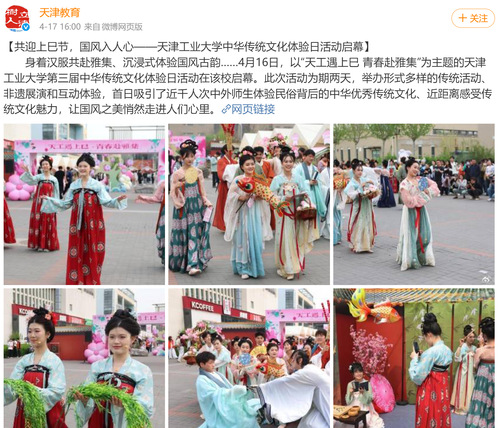 【共迎上巳节,国风入人心——天津工业大学中华传统文化体验日活动启幕】身着汉服共赴雅集、沉浸式体验国风古韵……4月16日,以“天工遇上巳 青春赴雅集”为主题的天津工业大学第三届中华传统文化体验日活动在该校启幕。此次活动为期两天,举办形式多样的传统活动、非遗展演和互动体验,首日吸引了近千人次中外师生体验民俗背后的中华优秀传统文化、近距离感受传统文化魅力,让国风之美悄然走进人们心里。