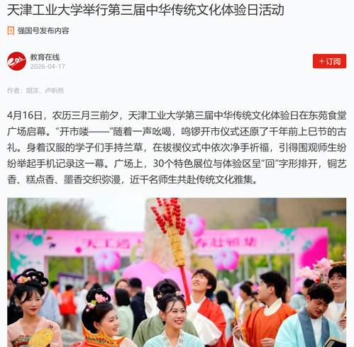 416日,农历三月三前夕,天津工业大学第三届中华传统文化体验日在东苑食堂广场启幕。“开市喽——”随着一声吆喝,鸣锣开市仪式还原了千年前上巳节的古礼。身着汉服的学子们手持兰草,在祓禊仪式中依次净手祈福,引得围观师生纷纷举起手机记录这一幕。广场上,30个特色展位与体验区呈“回”字形排开,铜艺香、糕点香、墨香交织弥漫,近千名师生共赴传统文化雅集。