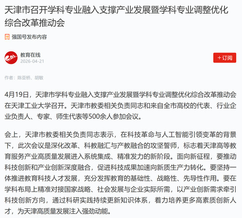 学习强国丨天津市召开学科专业融入支撑产业发展暨学科专业调整优化综合改革推动会