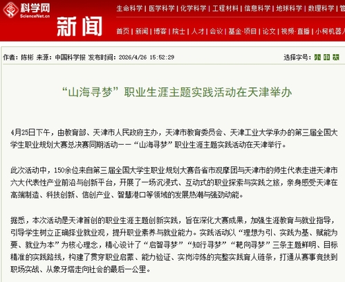 4月25日下午,由教育部、天津市人民政府主办,天津市教育委员会、天津工业大学承办的第三届全国大学生职业规划大赛总决赛同期活动——“山海寻梦”职业生涯主题实践活动在天津举行。